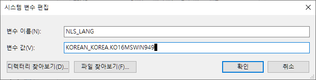 변수 값(V) : KOREAN_KOREA.KO16MSWIN949를 입력한다.