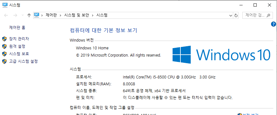 제어판 - 시스템 및 보안 - 시스템 - 고급 시스템 설정을 선택한다.