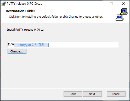puttygen 프로그램을 설치하는 경로를 임의적으로 지정하여 입력 후 Next 버튼을 선택한다.